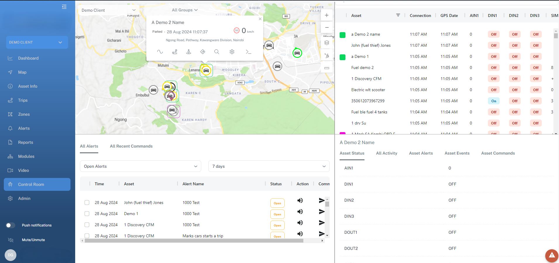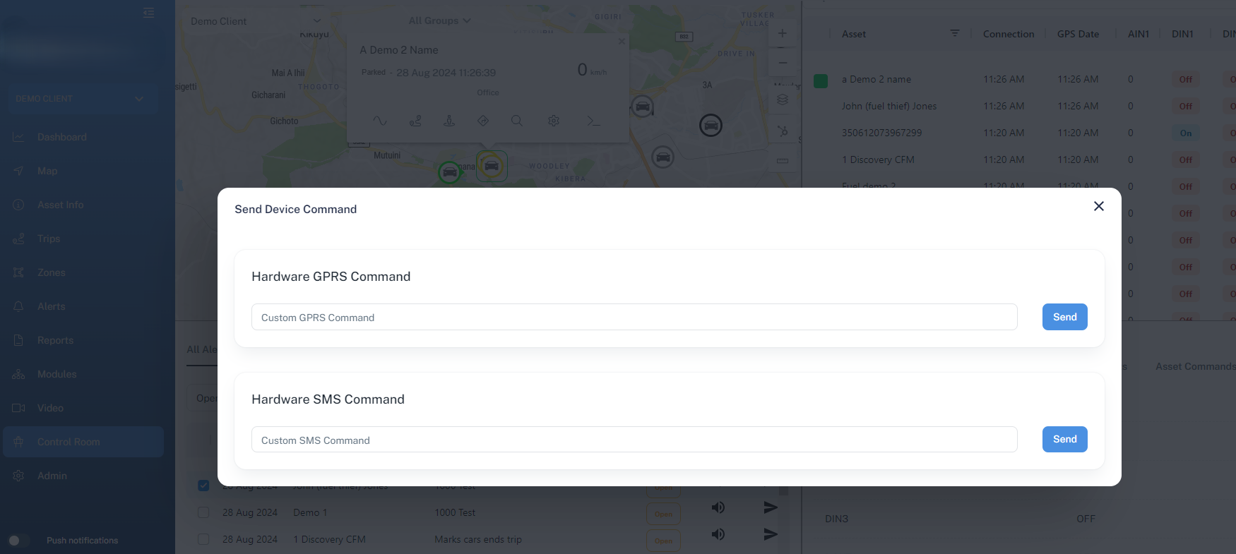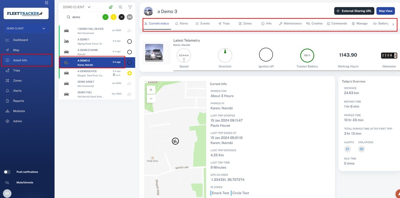 The Asset Info page is where you can access all the detailed and in depth information for a particular selected unit. At the top you will find the current status, which shows the latest data from the unit. below that you can find a telemetry button. This opens a window with the raw data messages from the unit. This is great for troubleshooting hardware! Underneath you will find various sub-tabs that you can open.