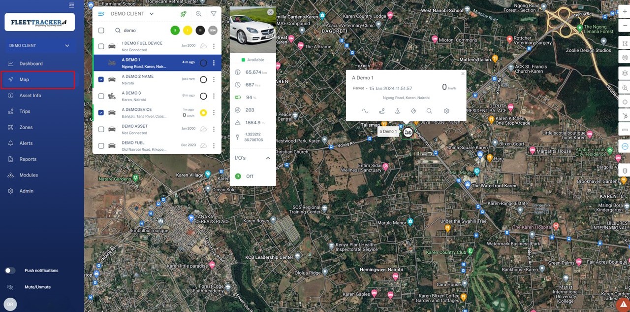 The Map page is the default page on login. This is where you do all your basic monitoring of vehicle positions and statuses. From this page you can select assets. This centers and zooms the screen to show the unit in detail with an asset bubble showing all current info. From this asset bubble you can click the links to zoom further, go to asset info, and trip replay. In the top right corner you will also find the controls for map zoom+ -, map layers, zone creation, and a measuring tool.