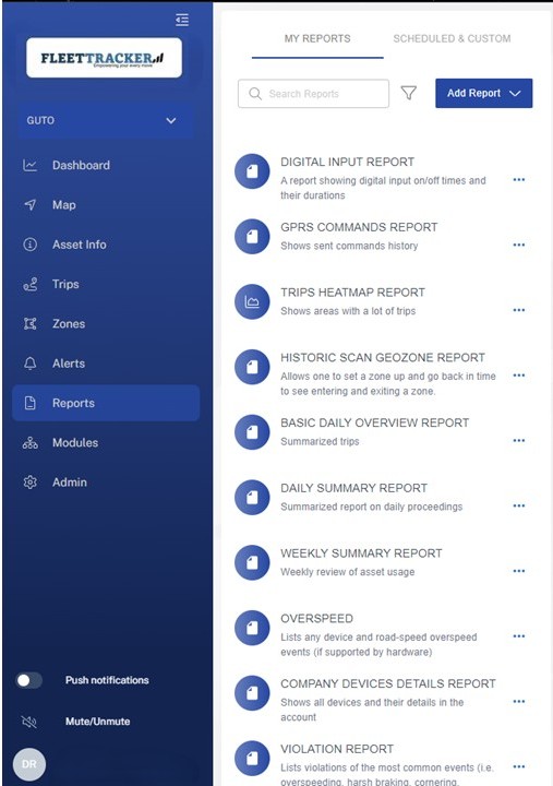 Here you can select whether to generate standard generic reports such as trip reports and violation reports or scheduled and custom reports.
