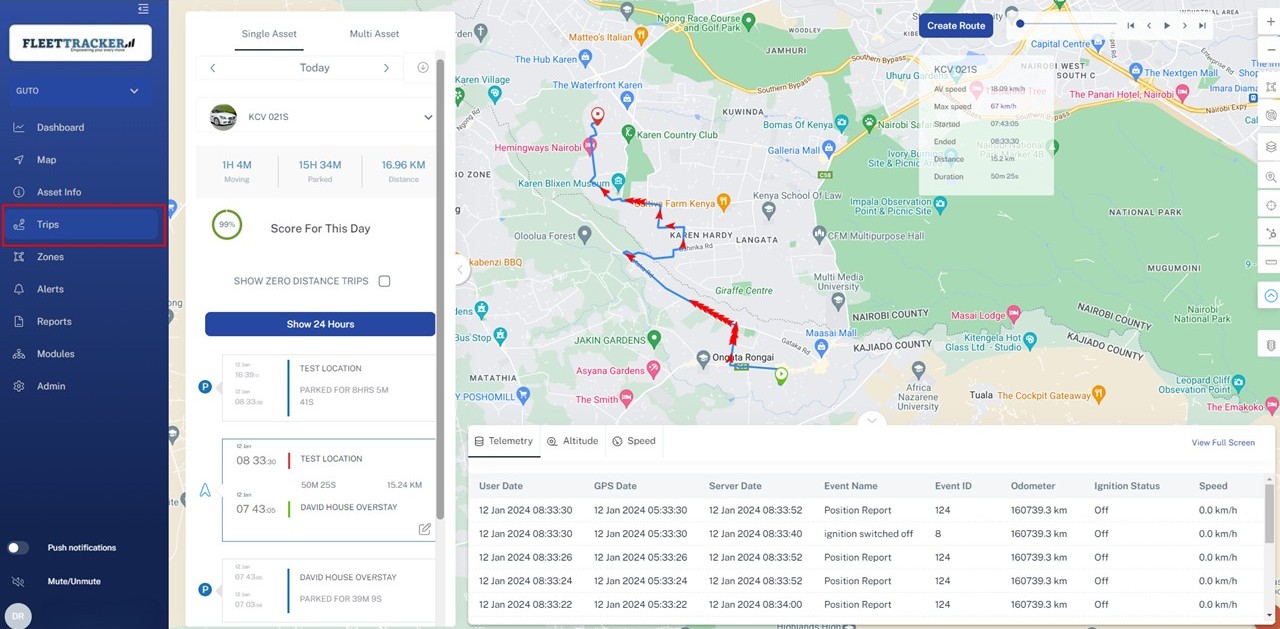 The trip replay page contains all information on the movement of the assets, on this page you can select the group of the desired asset and then the asset itself. After selecting the asset a list of the days trips will load.
